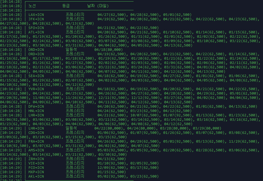 2026년 4월 18일 보너스 잔여석 현황 (해외→인천)매일 대한항공 역방향(해외→인천) 보너스 좌석을 모니터링하고 있습니다.2026년 4월 18일 기준으로 총 144건의 보너스 잔여석이 확인되었습니다.등급별로는 일등석 5건, 프레스티지 139건입니다. 가장 빠른 출발일은 26년 4/18(토) ORD→ICN 일등석입니다. ※ 잔여석은 실시간으로 변동됩니다.🔴 표시는 성수기 구간입니다.마일 높은 노선 순으로 정렬했습니다. 노선출발지등급날짜ORD→ICN시카고일등석26년 4/18(토) 🔴 (80,000마일)LHR→ICN런던일등석26년 4/22(수) NEW26년 4/24(금) NEW27년 3/28(일) NEW27년 3/29(월) NEW 🔴 (80,000마일)YVR→ICN밴쿠버프레스티지26년 5/20(수)2..