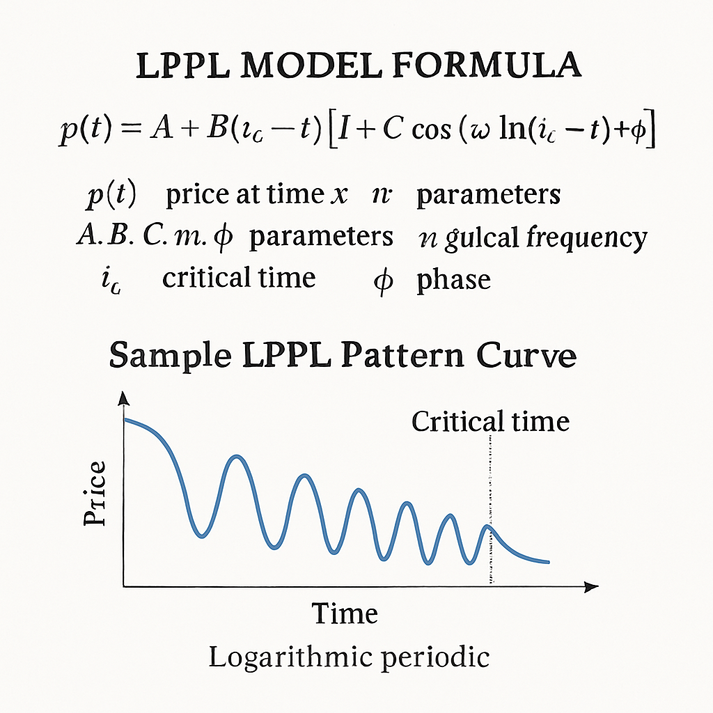 [이미지 5 삽입] 이미지 설명: LPPL 모델의 핵심 수식을 시각적으로 설명하는 다이어그램. 수식의 각 변수와 전형적인 LPPL 패턴을 보여주는 그래프가 포함된 교육용 차트.
