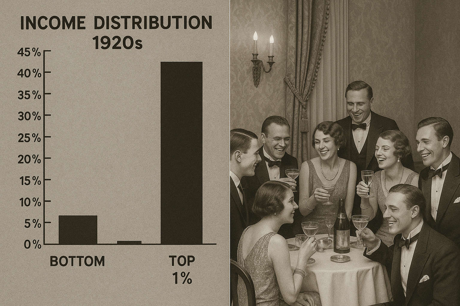 하지만 이런 화려한 수치들 뒤에는 극심한 소득 불평등이 자리잡고 있었다. 1928년까지 상위 1%가 전체 세전 소득의 23.9%를 차지했는데, 이는 금도금 시대와 맞먹는 수준이었다. 1920년대 동안 상위 1%의 소득은 75% 증가했지만, 나머지 99%는 겨우 9% 증가에 그쳤다. 미국인의 60%가 빈곤선 이하에서 살았고, 80%의 가정은 사실상 저축이 전혀 없었다.