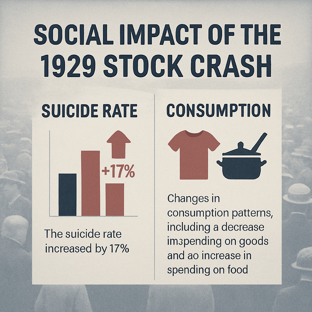 주식시장 폭락의 심리적 충격은 통계로 측정하기 어려운 부분이었다. 1929년 말까지 자살률이 17% 증가했고, 정신병원 입원률도 20% 상승했다. 특히 뉴욕시에서는 11월 한 달 동안 투자 손실 관련 자살이 22건 보고되었다.