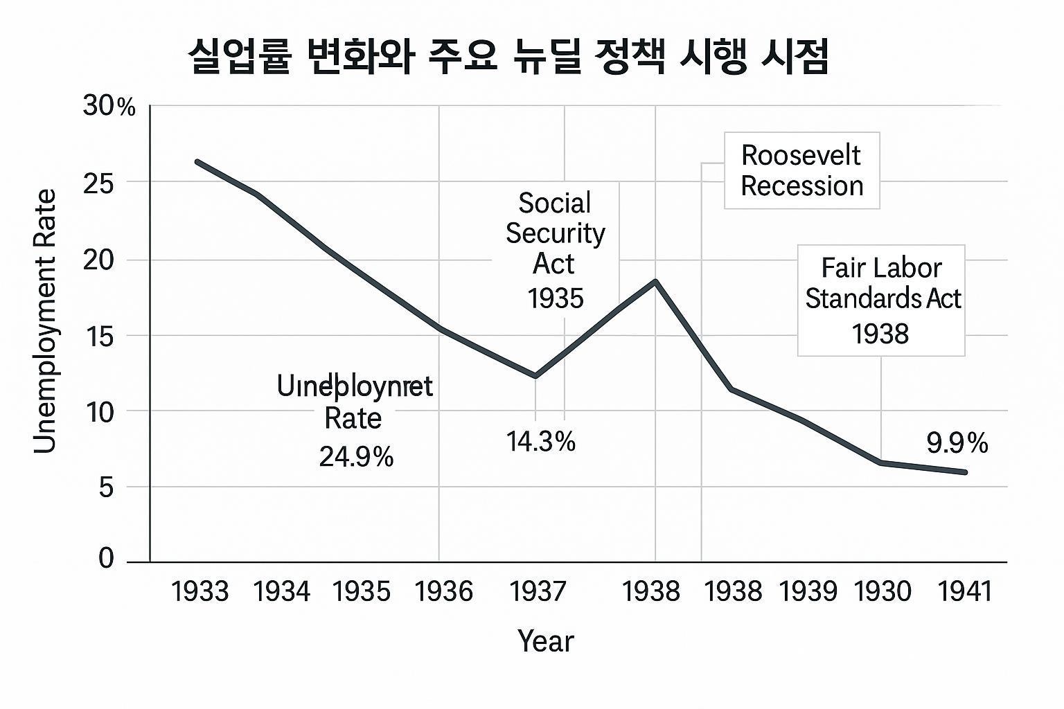 하지만 **1937-1938년 경기후퇴(Roosevelt Recession)**는 뉴딜 정책의 한계를 드러냈다. 1937년 실업률이 다시 19.0%로 상승하면서 회복세가 주춤했다¹⁵. 이는 재정 지출 삭감과 통화 긴축이 복합적으로 작용한 결과였다.