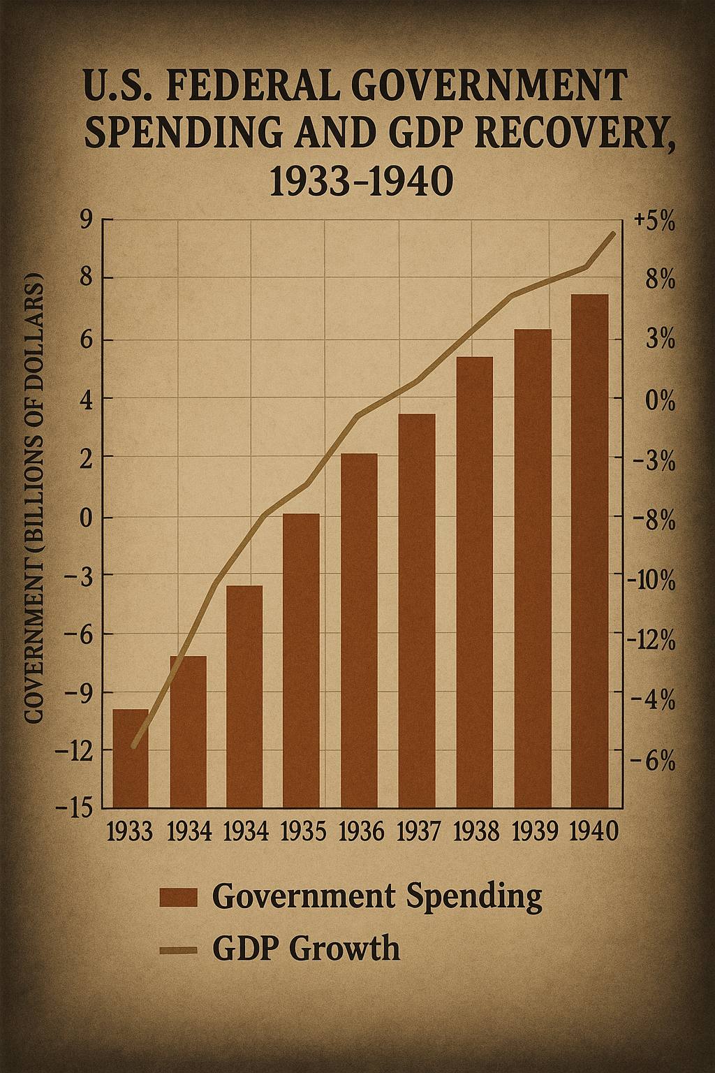 뉴딜 정책의 핵심은 **적극적 재정 정책(Active Fiscal Policy)**이었다. 연방정부 지출은 1933년 46억 달러에서 1939년 92억 달러로 두 배 증가했다⁵. 이는 GDP 대비 9.8%에서 10.5%로 상승한 것이다.