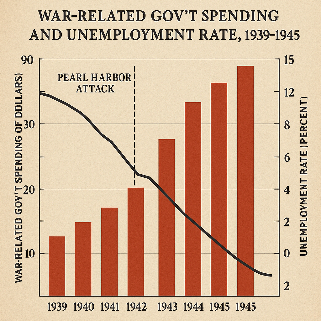 **이에 대해 케인스는 1940년 "전쟁이 마침내 뉴딜이 하지 못한 것을 해냈다"**고 평가했다²⁵. 앨빈 한센 역시 **"전쟁 경제가 재정정책의 진정한 위력을 보여주었다"**고 분석했다²⁶.
