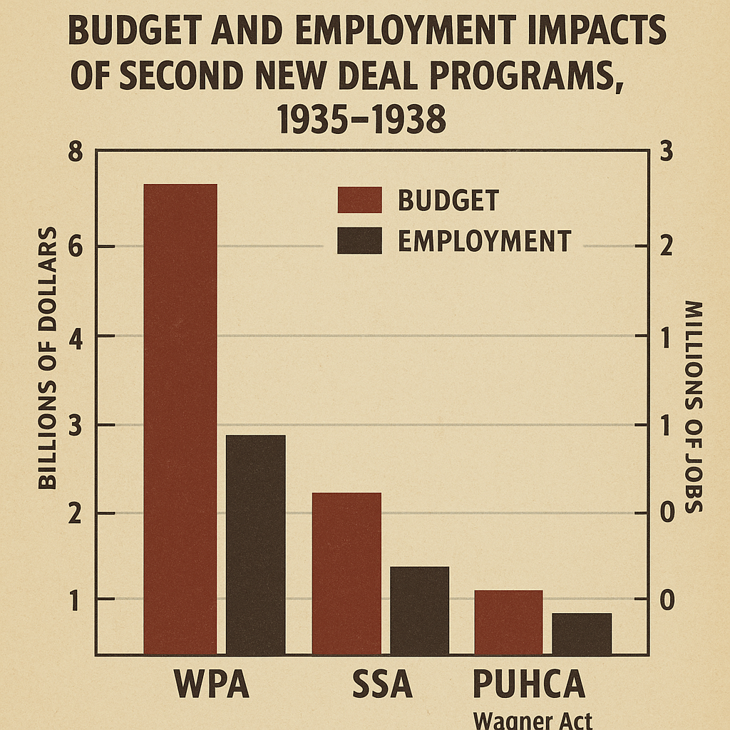 공공사업 프로그램의 규모는 특히 주목할 만하다. **민간자원보존단(CCC)**은 1933-1942년 동안 300만 명을 고용했고⁶, **공공사업진흥청(WPA)**은 1935-1943년 동안 850만 명을 고용했다⁷. **공공사업청(PWA)**은 1933-1939년 동안 340억 달러를 투입했다⁸.
