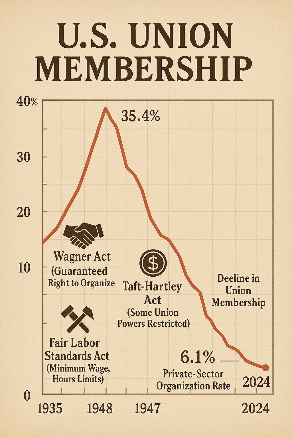 1970년대 이후 노동조합 조직률 지속적 하락도 주목할 변화다. **2024년 현재 민간부문 조직률은 6.1%**로 뉴딜 시대와는 크게 달라졌다³⁷.