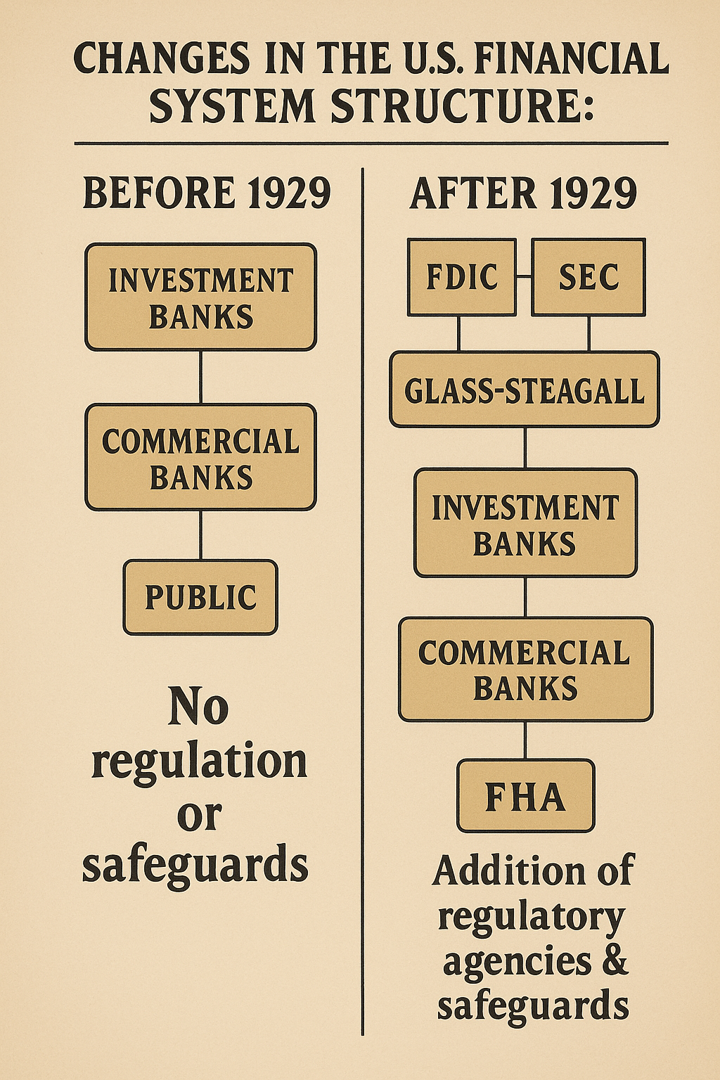대공황이 가져온 가장 근본적인 변화는 금융 시스템의 구조적 재편이었다. **1933년 글래스-스티걸법(Glass-Steagall Act)**을 통한 상업은행과 투자은행의 분리는 66년간 지속되어 1999년 그램-리치-블라일리법(Gramm-Leach-Bliley Act)으로 폐지될 때까지 미국 금융업의 근간이 되었다³.