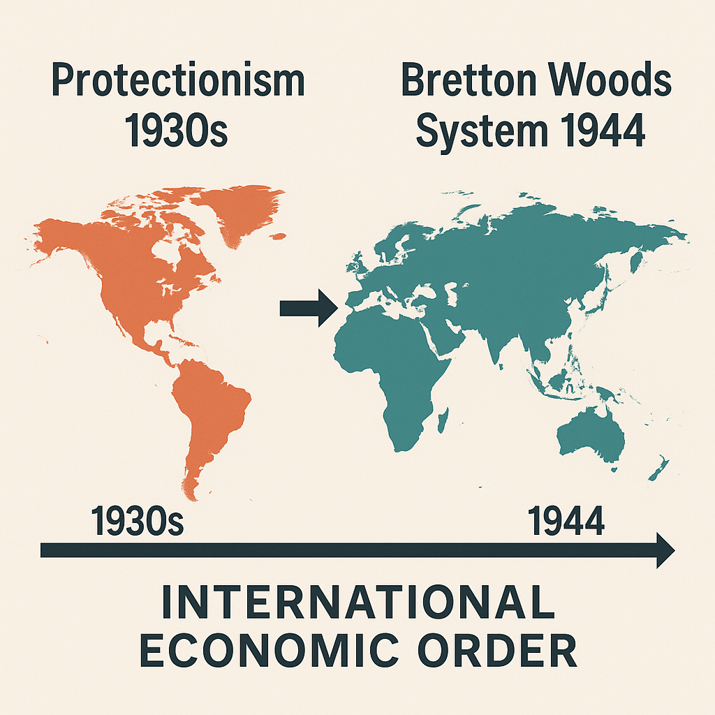 1944년 브레튼우즈 체제는 이러한 교훈의 산물이었다. 국제통화기금(IMF), 세계은행(World Bank), 관세무역일반협정(GATT) 등을 통한 국제 경제 협력 체계가 구축되었다²⁹.