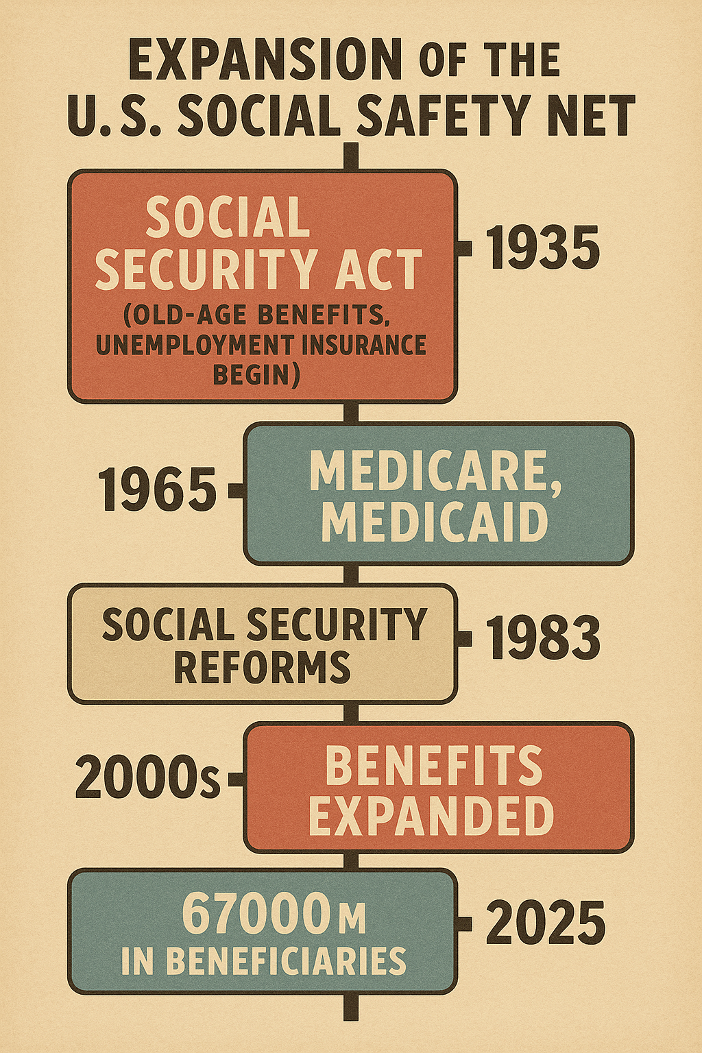 **메디케어(1965년)**와 메디케이드(1965년) 확립도 사회보장법의 연장선상에서 이해할 수 있다. 정부가 사회적 위험을 보장해야 한다는 뉴딜 시대의 철학이 의료 분야로 확장된 것이다¹⁰.