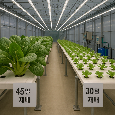 Q4. 30일과 45일 재배를 함께 할 수 있나요? A4. 가능합니다. 시설을 구역별로 나누어 15일 간격으로 파종하면 연속 수확이 가능하고, 시장 상황에 따라 수확 시기를 조절할 수 있어 리스크 분산 효과가 있습니다.