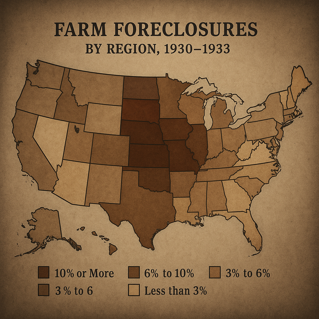 1930년부터 1935년까지 약 75만 농장이 압류되었으며, 이는 전체 농장의 18%에 해당한다²¹. 아이오와주의 경우 1932년 한 해에만 3만 8천 건의 농장 압류가 있었다.