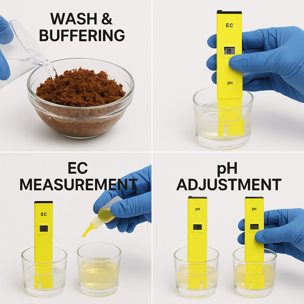 버퍼링 단계: • 1단계: 압축된 코코피트를 충분한 물에 담가 팽창시키기 (12-24시간) • 2단계: 지속적인 물 공급으로 염분 제거 (7-10일)